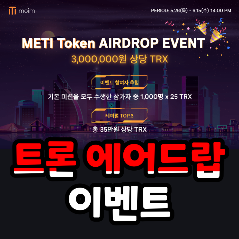 메티토큰(METI Token) 상장기념 TRX 1,000명에게 에어드랍 이벤트를 진행합니다.